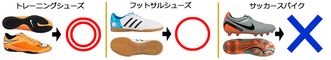 それらのシューズ使用をお見かけした場合、ご注意と、貸し靴(税込500円)の利用をご案内させていただきます。 - トレーニングシューズ、フットサルシューズなど、靴底が平らなシューズを利用ください。